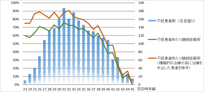 全年齢での生児獲得率は62%で、また積極的な治療の前に中断された方を除くと、全年齢で75%になります。