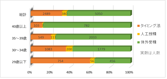 年齢が高くなると妊娠しにくくなり、ステップアップするため体外受精の割合が増えます。