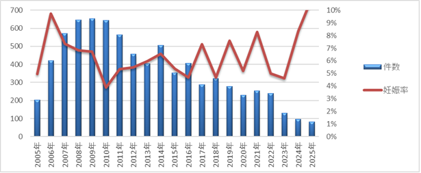 1回あたりの妊娠率は6%程度ですが、6回人工授精を実施した累積妊娠率は25%程度になります。